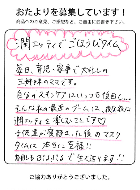 肌の表面をぬらすだけのスキンケアが苦手だけど、パックで時間おくからしっかり水分が浸透して内側からウルウルになりました。気持ちよかった!!