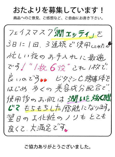 フェイスマスク「潤エッティ」を3日に1回、3連続で使用してみた。忙しい夜のお手入れに最適です!